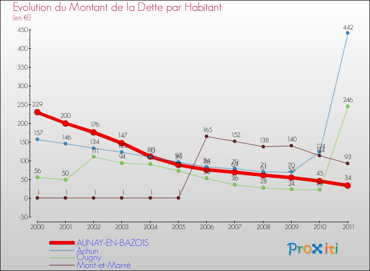 Pendant la même période, les communes françaises similaires à Aunay-en-Bazois, ont vu leur dette par habitant augmenter de 41.73 % en moyenne entre 2000 et 2011.