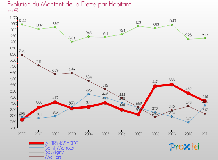 Pendant la même période, les communes françaises similaires à Autry-Issards, ont vu leur dette par habitant augmenter de 19.13 % en moyenne entre 2000 et 2011.