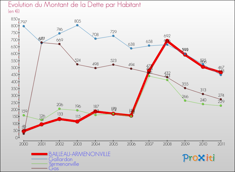 A Bailleau-Armenonville, la dette par habitant a donc augmenté de 915.22 % entre 2000 et 2011.