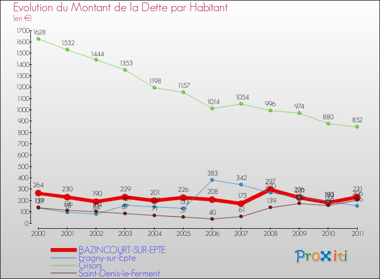 A Bazincourt-sur-Epte, la dette par habitant a donc baissé de 12.5 % entre 2000 et 2011.