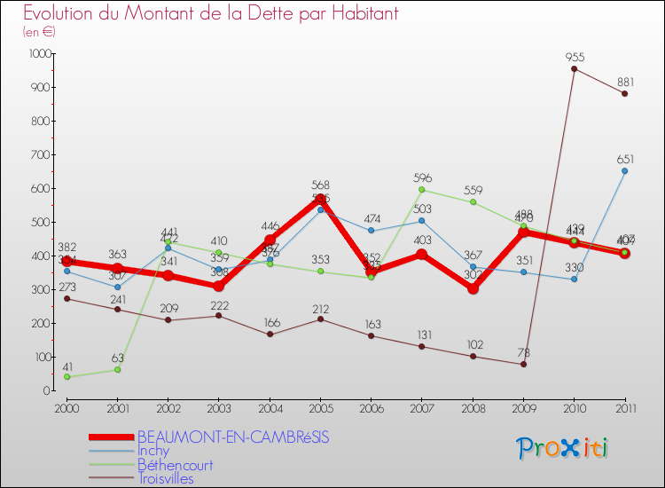 Pendant la même période, les communes françaises similaires à Beaumont-en-Cambrésis, ont vu leur dette par habitant augmenter de 33.6 % en moyenne entre 2000 et 2011.
