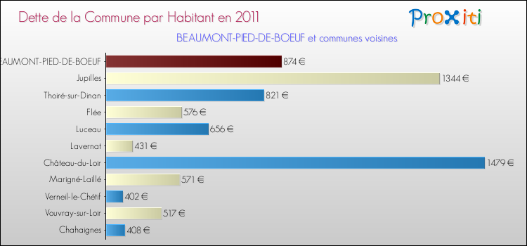 A Beaumont-Pied-de-Boeuf, la dette due par habitant de la commune en 2011 est donc plus élevée de 35.71 % que pour des communes similaires.