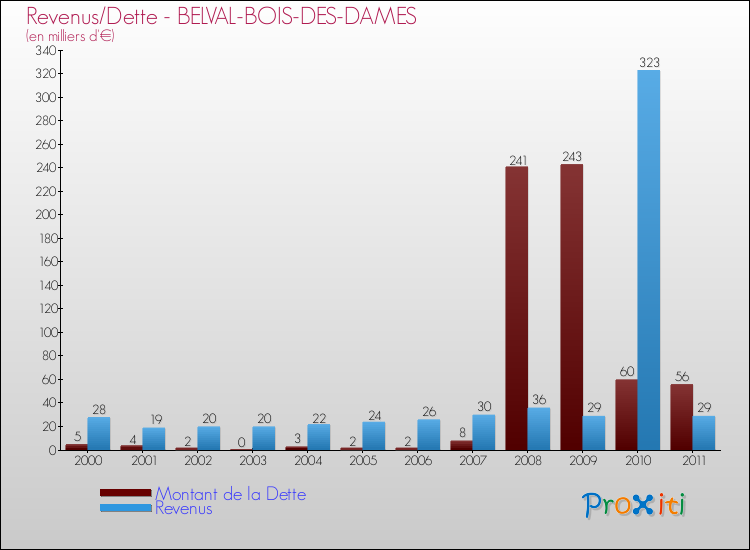 Comparaison de la dette et des revenus pour BELVAL-BOIS-DES-DAMES de 2000 à 2011