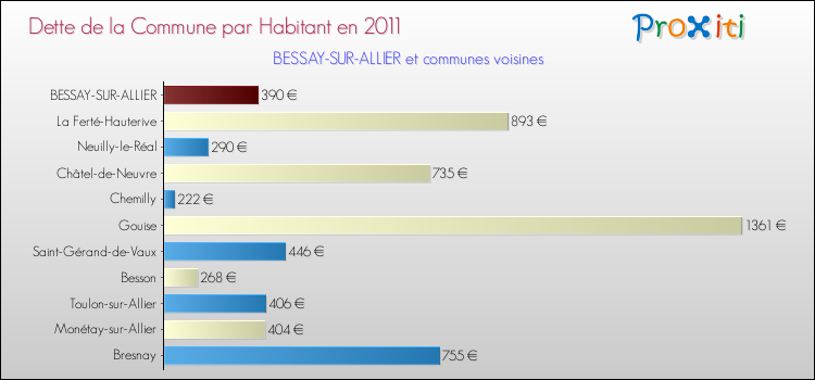 A noter : la valeur moyenne de la dette par habitant des communes françaises similaires à Bessay-sur-Allier était de 592 € par habitant, en 2011.