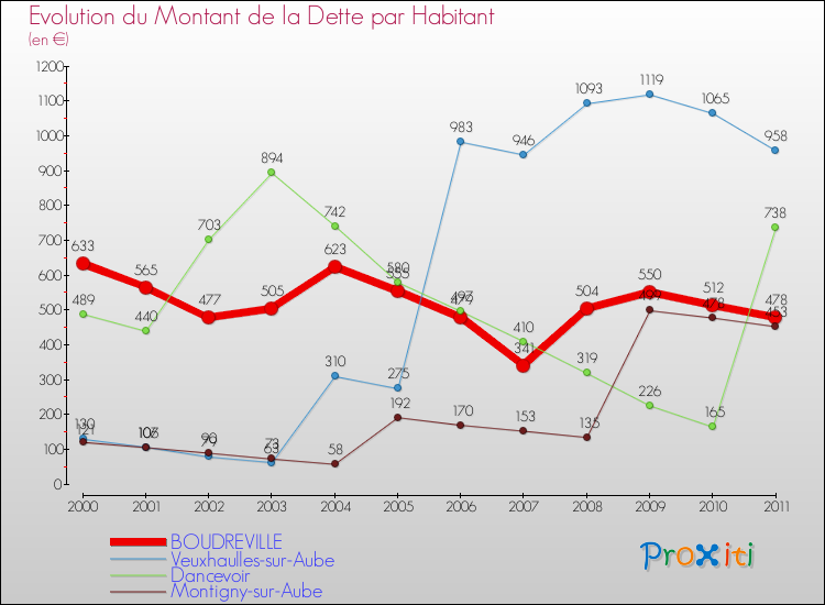 Pendant la même période, les communes françaises similaires à Boudreville, ont vu leur dette par habitant augmenter de 24.08 % en moyenne entre 2000 et 2011.