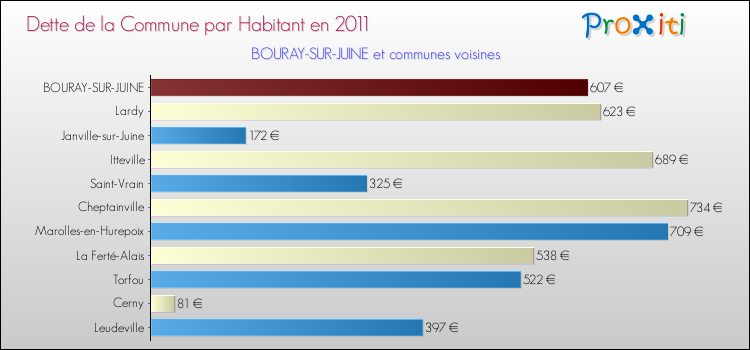 A Bouray-sur-Juine, la dette par habitant a donc augmenté de 74.43 % entre 2000 et 2011.