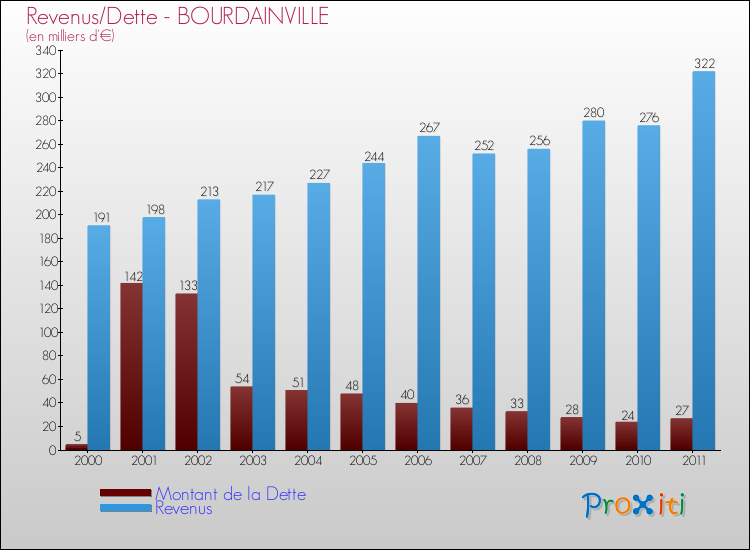 Comparaison Revenus/Dette de Bourdainville (de 2000 à 2011)