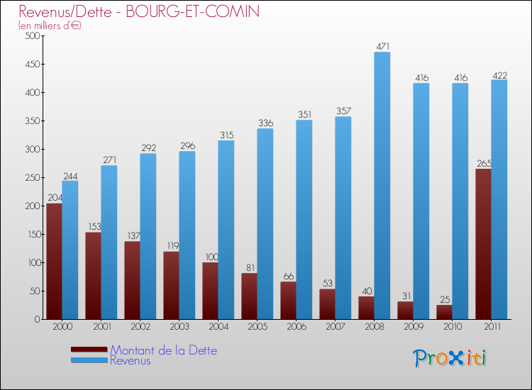 Comparaison Revenus/Dette de Bourg-et-Comin (de 2000 à 2011)