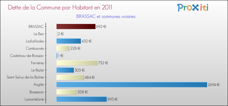 A Brassac, la dette due par habitant de la commune en 2011 est donc plus élevée de 16.89 % que pour des communes similaires.