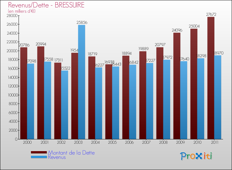 Comparaison Revenus/Dette de Bressuire (de 2000 à 2011)