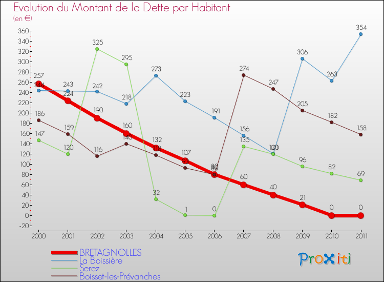Par rapport aux 187 habitants de Bretagnolles, en 2011 le poids de cette dette représente 0 € par habitant.