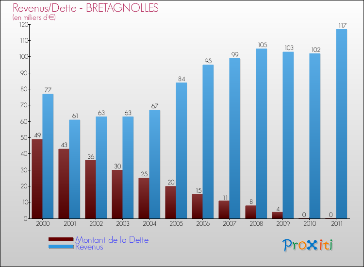 Comparaison Revenus/Dette de Bretagnolles (de 2000 à 2011)
