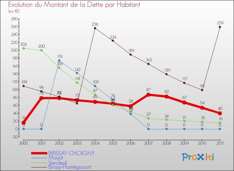 Par rapport aux 327 habitants de Brissay-Choigny, en 2011 le poids de cette dette représente 40 € par habitant.