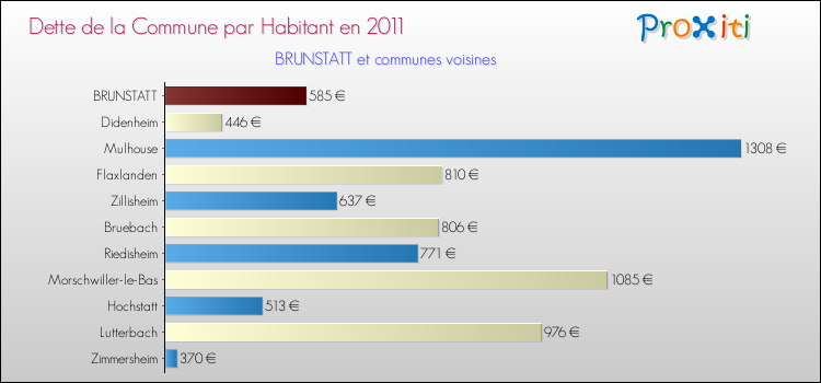 Par rapport aux 6 310 habitants de Brunstatt, en 2011 le poids de cette dette représente 585 € par habitant.