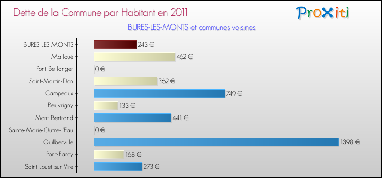 A Bures-les-Monts, la dette due par habitant de la commune en 2011 est donc moins élevée de 51.88 % que pour des communes similaires.
