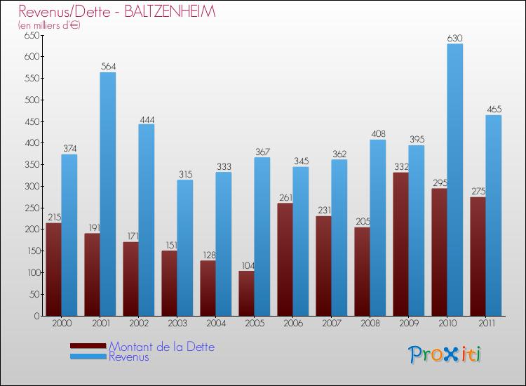 Comparaison Revenus/Dette de Baltzenheim (de 2000 à 2011)