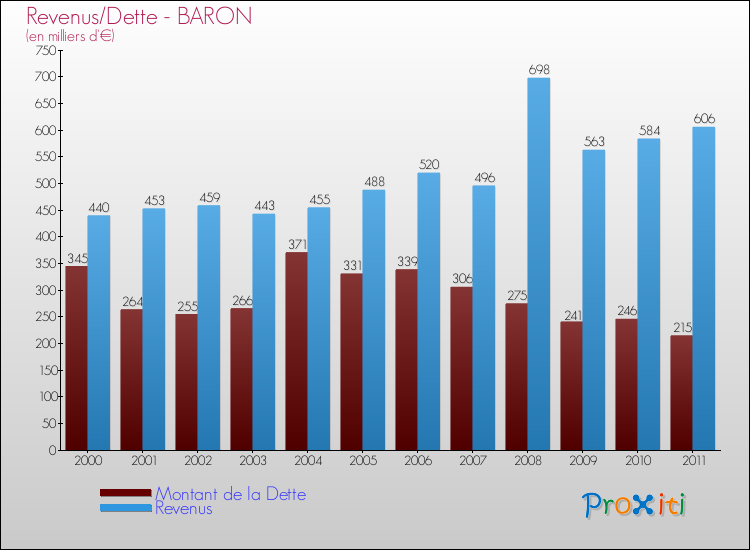 Par rapport aux 1 005 habitants de Baron, en 2011 le poids de cette dette représente 214 € par habitant.