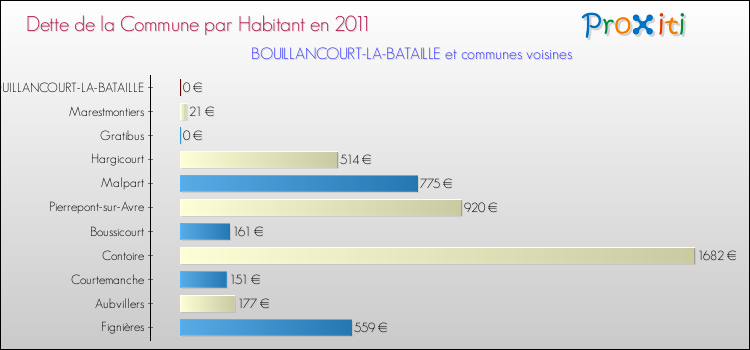 A noter : la valeur moyenne de la dette par habitant des communes françaises similaires à Bouillancourt-la-Bataille était de 505 € par habitant, en 2011.