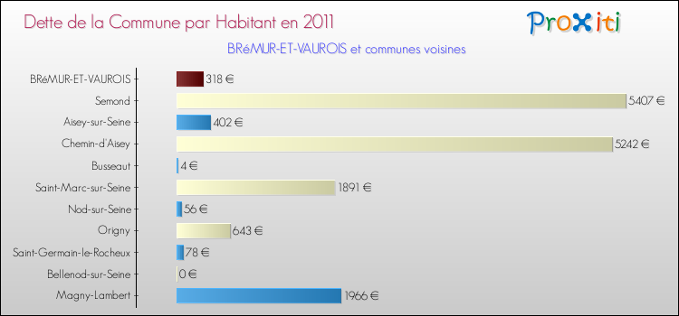 A Brémur-et-Vaurois, la dette par habitant a donc augmenté de 736.84 % entre 2000 et 2011.