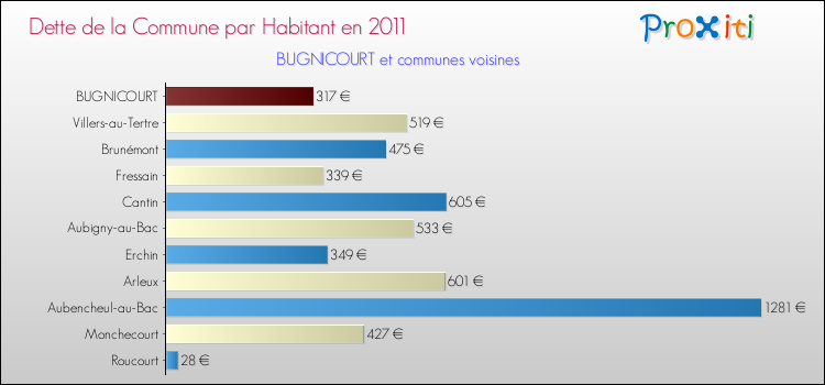 A noter : la valeur moyenne de la dette par habitant des communes françaises similaires à Bugnicourt était de 592 € par habitant, en 2011.