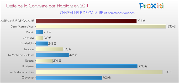 A noter : la valeur moyenne de la dette par habitant des communes françaises similaires à Châteauneuf-de-Galaure était de 706 € par habitant, en 2011.