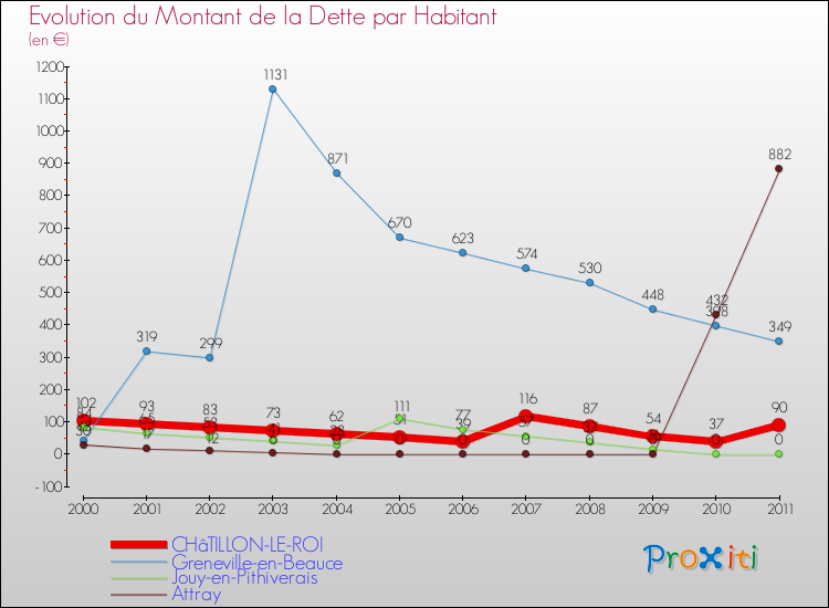A Châtillon-le-Roi, la dette par habitant a donc baissé de 11.76 % entre 2000 et 2011.