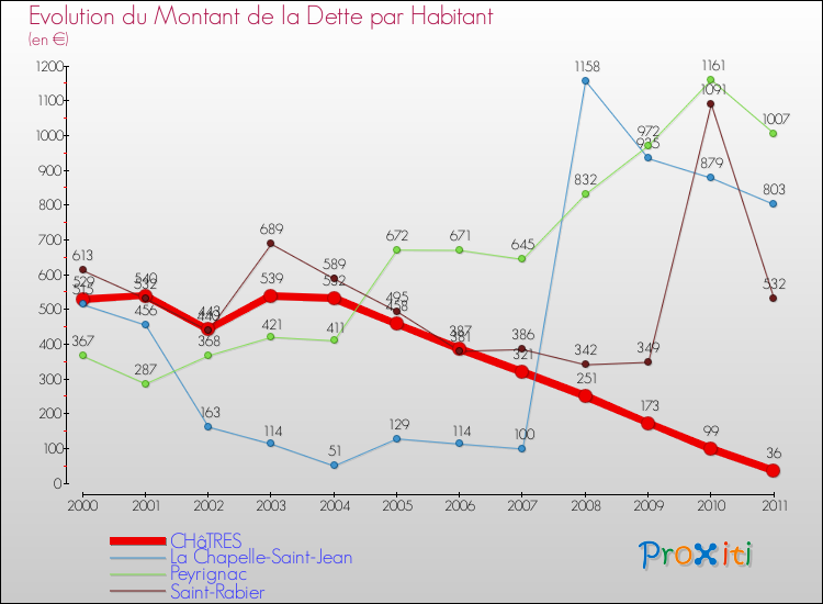 Comparaison de la dette par habitant de la commune en 2011 pour CHâTRES et les communes voisines