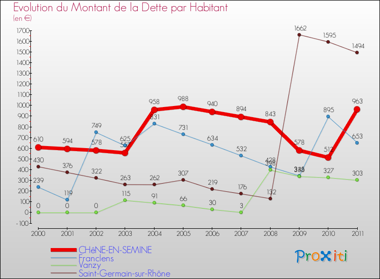 Pendant la même période, les communes françaises similaires à Chêne-en-Semine, ont vu leur dette par habitant baisser de 6.27 % en moyenne entre 2000 et 2011.