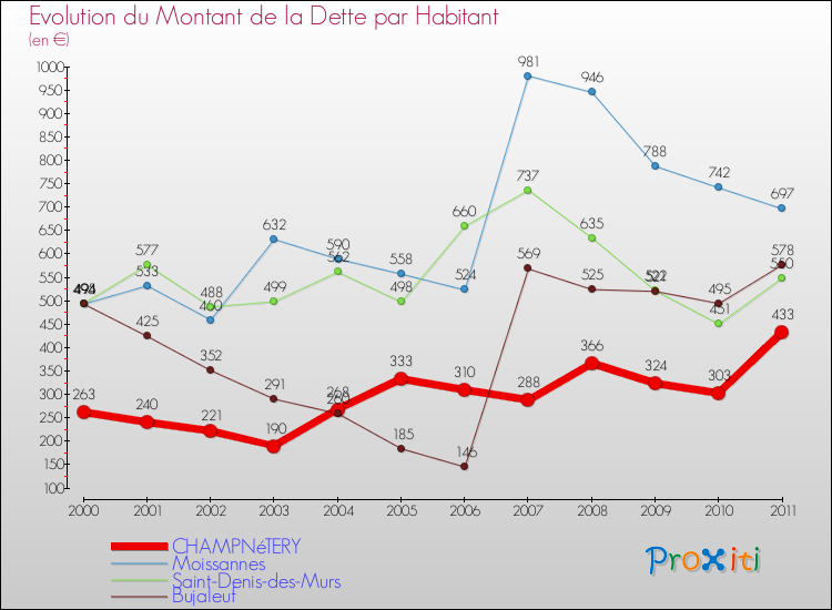 Pendant la même période, les communes françaises similaires à Champnétery, ont vu leur dette par habitant augmenter de 34.85 % en moyenne entre 2000 et 2011.
