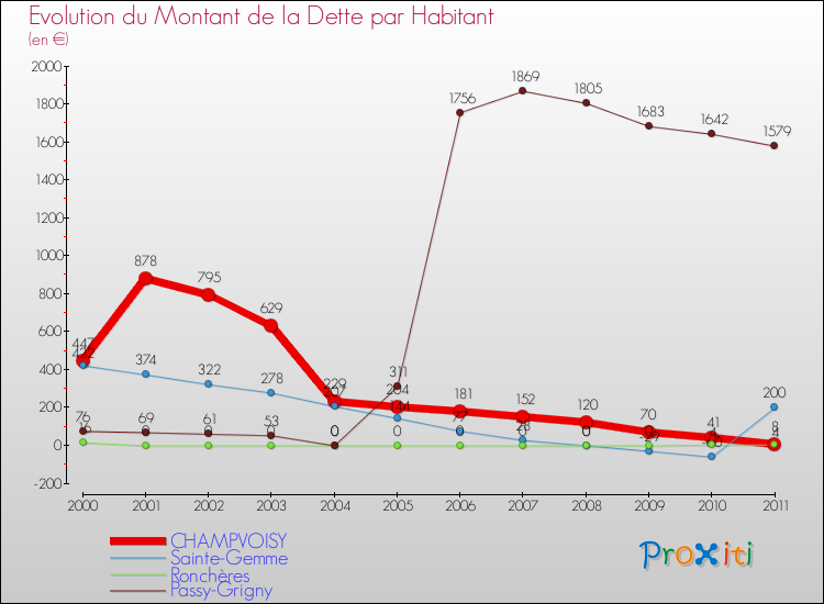 A Champvoisy, la dette par habitant a donc baissé de 98.21 % entre 2000 et 2011.