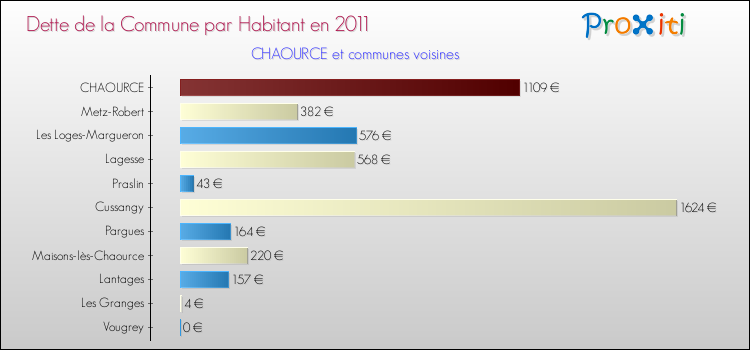 A Chaource, la dette due par habitant de la commune en 2011 est donc plus élevée de 72.2 % que pour des communes similaires.