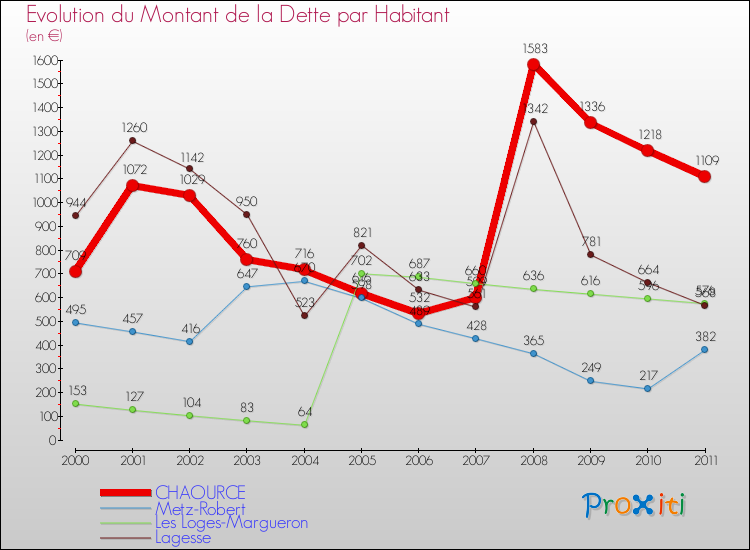 A Chaource, la dette par habitant a donc augmenté de 56.42 % entre 2000 et 2011.