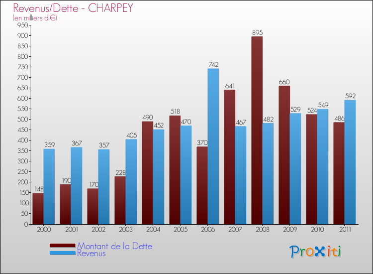 Comparaison Revenus/Dette de Charpey (de 2000 à 2011)