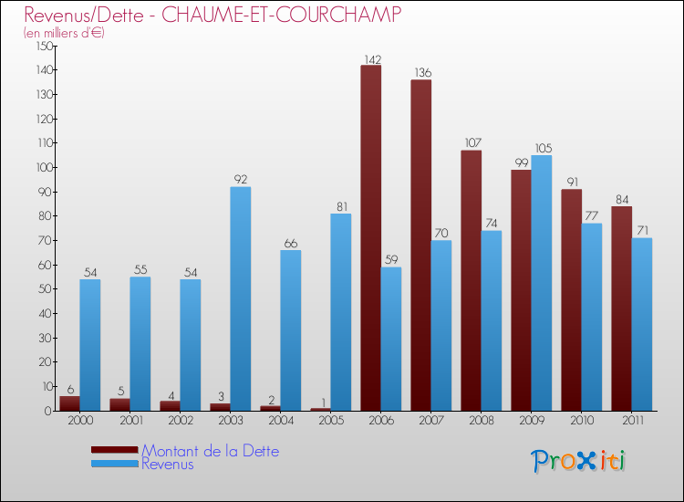 Comparaison Revenus/Dette de Chaume-et-Courchamp (de 2000 à 2011)