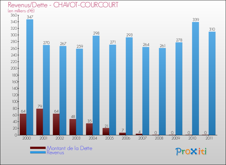 Comparaison Revenus/Dette de Chavot-Courcourt (de 2000 à 2011)