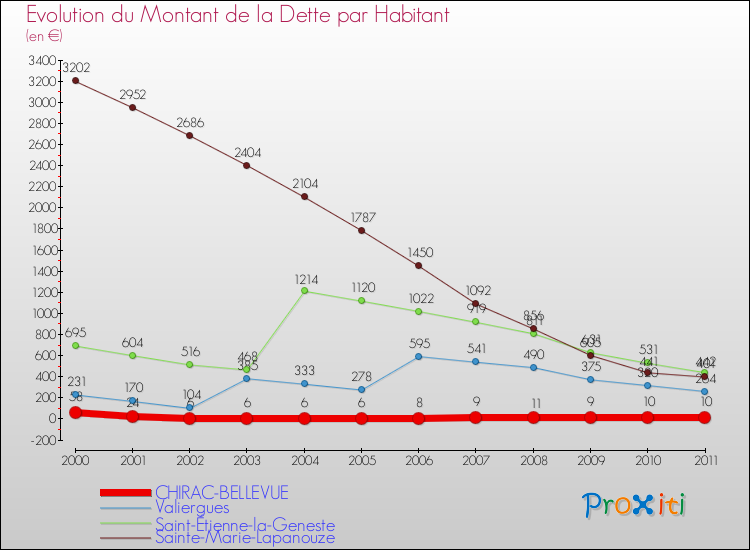 A Chirac-Bellevue, la dette par habitant a donc baissé de 82.76 % entre 2000 et 2011.