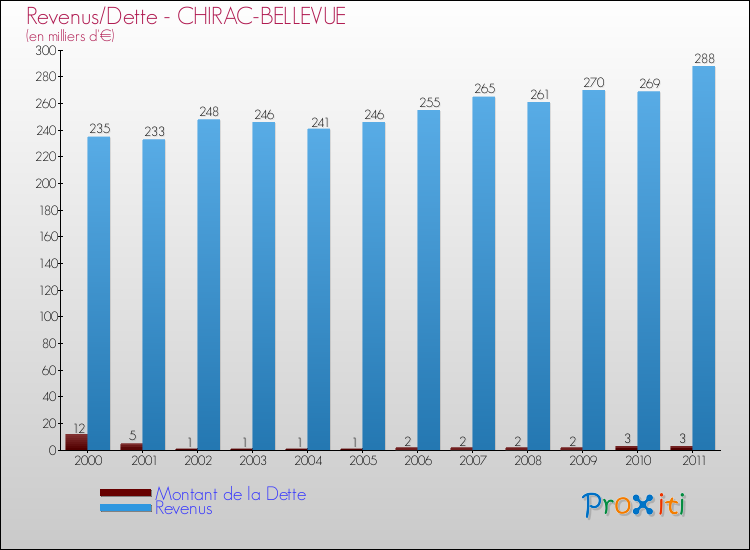 Par rapport aux 266 habitants de Chirac-Bellevue, en 2011 le poids de cette dette représente 10 € par habitant.