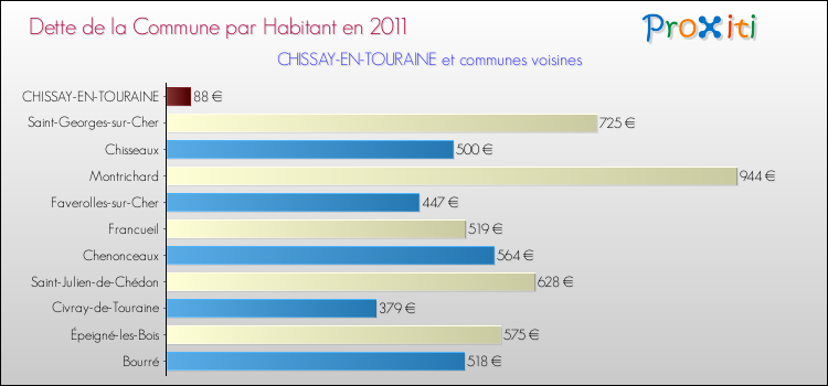 Par rapport aux 1 153 habitants de Chissay-en-Touraine, en 2011 le poids de cette dette représente 88 € par habitant.