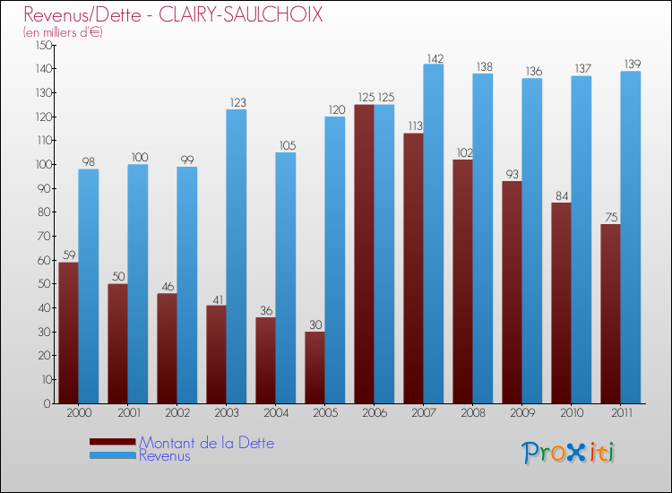 Comparaison Revenus/Dette de Clairy-Saulchoix (de 2000 à 2011)
