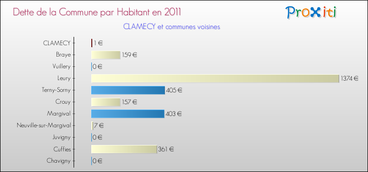 A Clamecy, la dette due par habitant de la commune en 2011 est donc moins élevée de 99.8 % que pour des communes similaires.