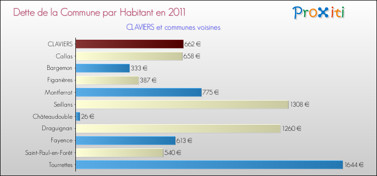 A Claviers, la dette due par habitant de la commune en 2011 est donc plus élevée de 11.82 % que pour des communes similaires.