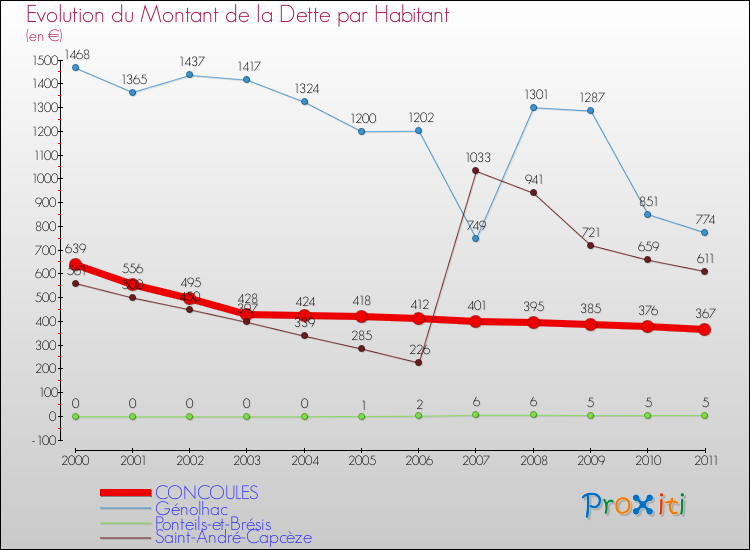 Pendant la même période, les communes françaises similaires à Concoules, ont vu leur dette par habitant augmenter de 19.13 % en moyenne entre 2000 et 2011.