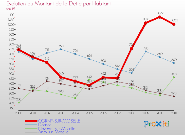 Pendant la même période, les communes françaises similaires à Corny-sur-Moselle, ont vu leur dette par habitant augmenter de 28.6 % en moyenne entre 2000 et 2011.