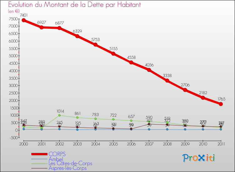 A Corps, la dette par habitant a donc baissé de 76.15 % entre 2000 et 2011.