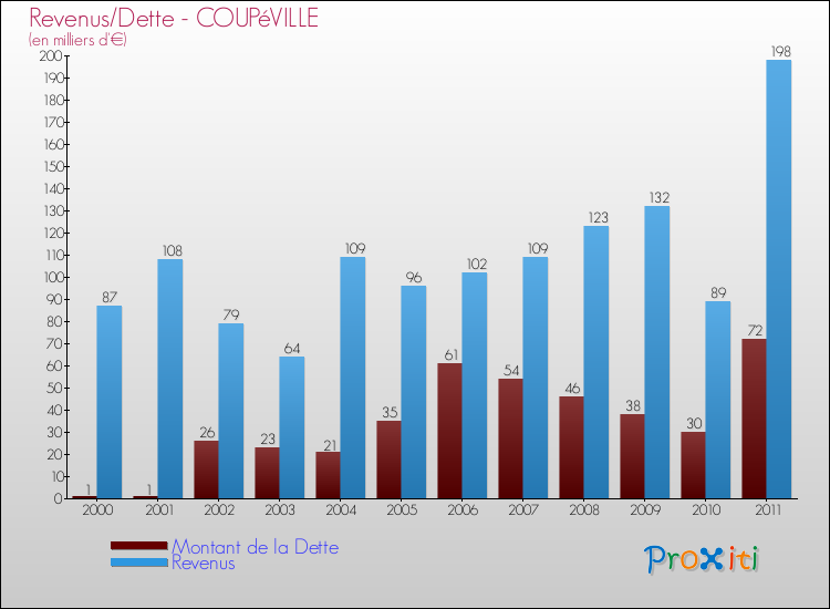 Comparaison Revenus/Dette de Coupéville (de 2000 à 2011)