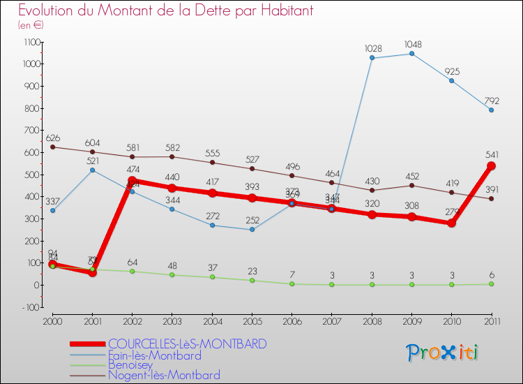 Pendant la même période, les communes françaises similaires à Courcelles-lès-Montbard, ont vu leur dette par habitant augmenter de 24.08 % en moyenne entre 2000 et 2011.