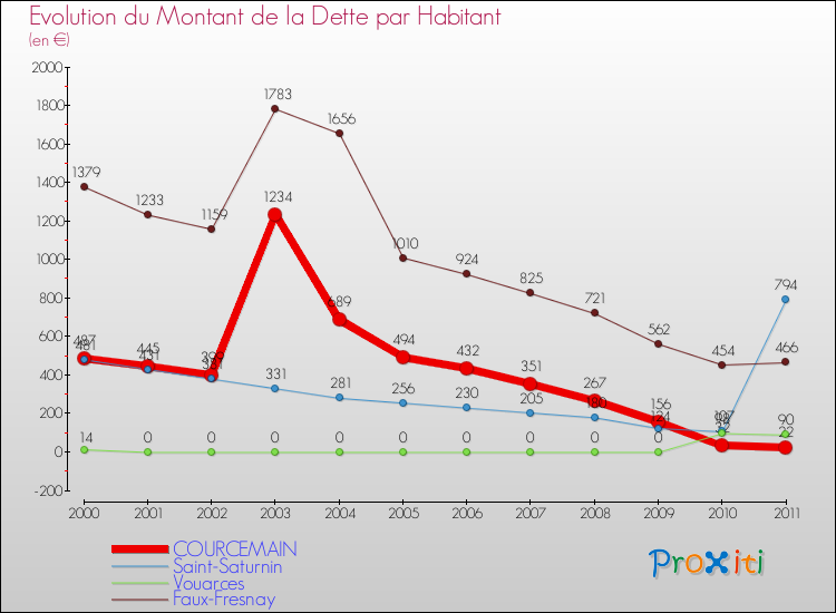 Pendant la même période, les communes françaises similaires à Courcemain, ont vu leur dette par habitant augmenter de 24.08 % en moyenne entre 2000 et 2011.