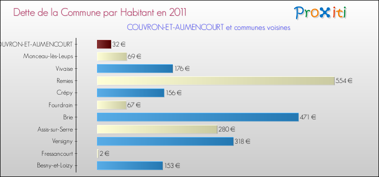 A noter : la valeur moyenne de la dette par habitant des communes françaises similaires à Couvron-et-Aumencourt était de 592 € par habitant, en 2011.