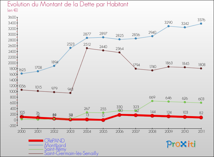 Pendant la même période, les communes françaises similaires à Crépand, ont vu leur dette par habitant augmenter de 19.13 % en moyenne entre 2000 et 2011.