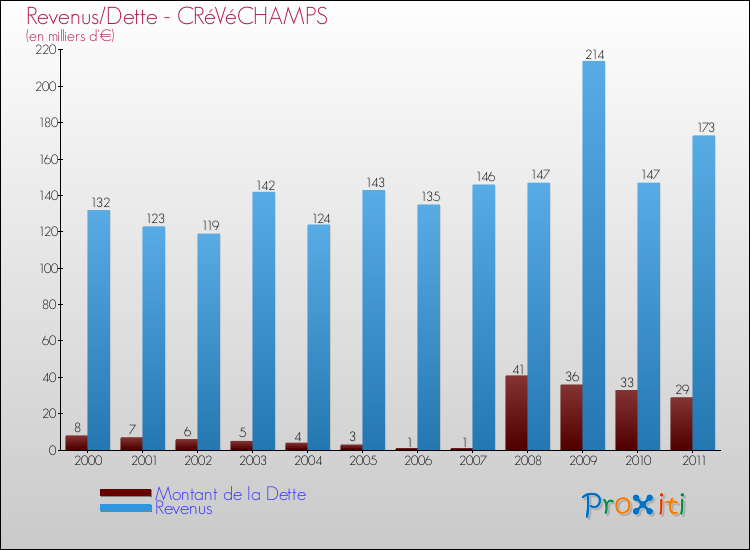 Comparaison Revenus/Dette de Crévéchamps (de 2000 à 2011)